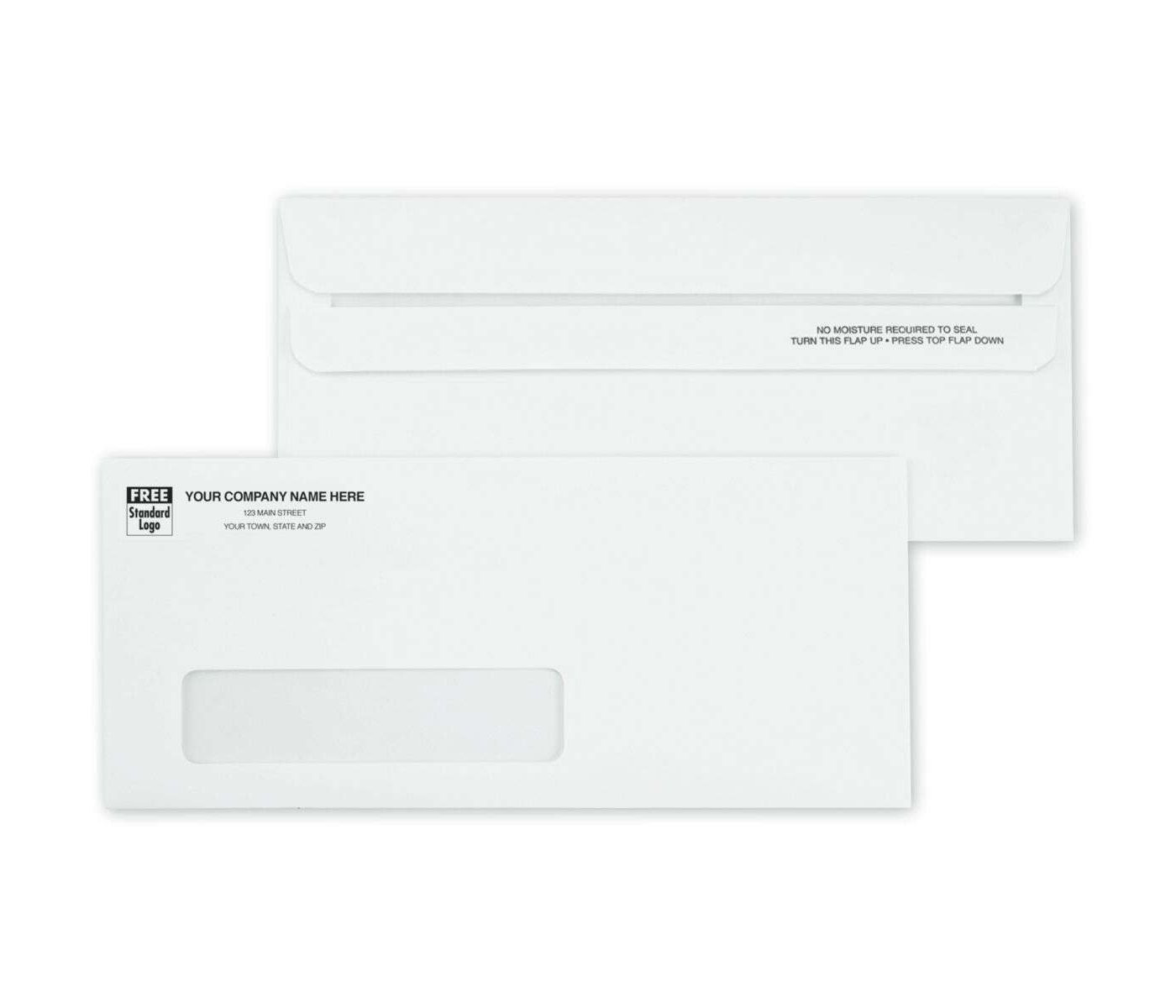 Additional customization options include imprinting your custom logo.; ATTENTION: Remove the "P" block & lines if postal indicia is not being used.; Quality construction stands up in the mail.; Crisp, bright white wove paper stock immediately conveys a professional image.; Close every envelope quickly & cleanly with self-seal flap.; Our business envelopes save time & send a great impression with your company imprint & handy recipient address window!; Never address an envelope again! Great for letters, invoices, statements, proposals & other mailings.; Free personalization includes your business imprint plus choice ink colors, typeface & standard business logo. 2 ink colors is available at an extra charge..; Choice of 1 or 2 ink colors QUAL:LAYOUT A HAS PE BLOCK. USE LAYOUT B FOR CUSTOM LOGO OR LARGER IMPRINT.; LAYOUT A HAS PE BLOCK. USE LAYOUT B FOR CUSTOM LOGO OR LARGER IMPRINT.; Window Size: 4 1/2 x 1 1/8". 7/8" from left. 2 1/2" from the top CALL:Lowest Price