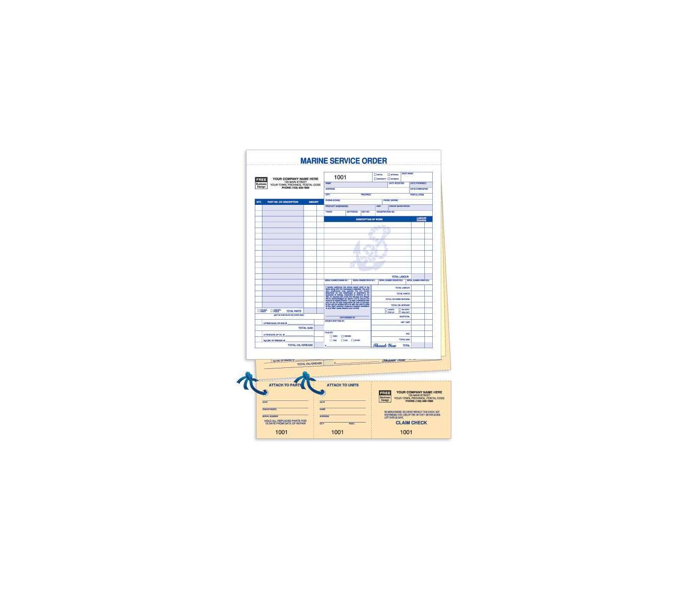 Last copy is manila tag stock; Default number will begin at 0001 unless otherwise specified.; This Marine Service Order is quick to write up and easy to read. Combines in one handy, three-part set: Service Order, Job Record, Invoice, Claim Check, I.D. Tag for Parts, and I.D. Tag for Unit.